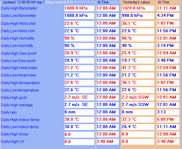 | Maximum Temperature (since midnight) | 12.8°C at: 12:28 PM | Minimum Temperature (since midnight) | -1.6°C at: 4:15 AM |